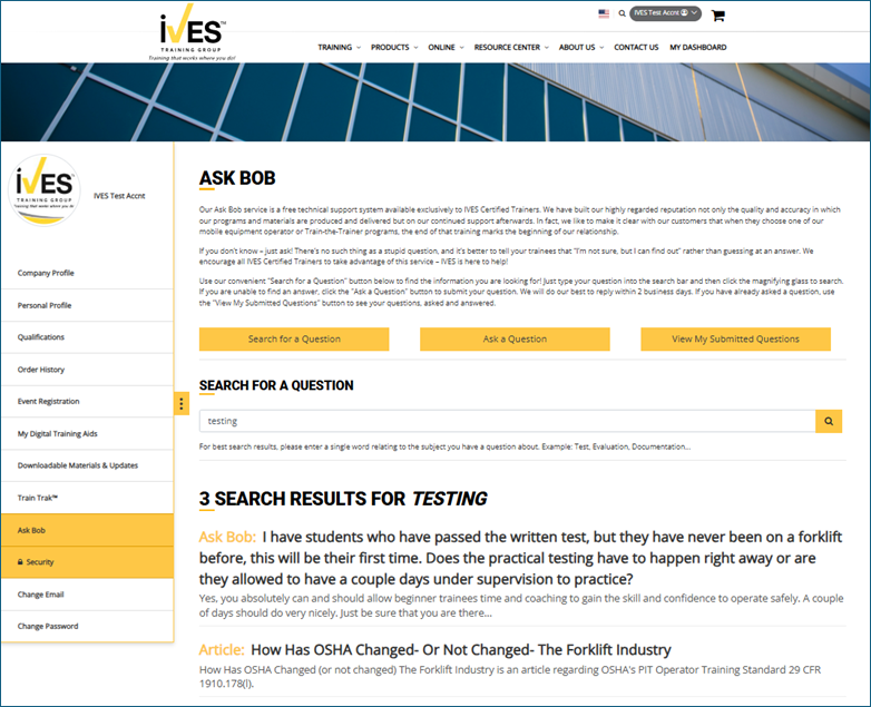 When searching for an answer to your question, you will see that the results are either a question that another trainer has asked and Bob has answered, or a related article that contains pertinent information.